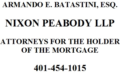 PATRICK J. McDONALD, ESQ. ROBERTS, CARROLL, FELDSTEIN & PEIRCE INCORPORATED. ATTORNEYS FOR THE HOLDER OF THE MORTGAGE. 401-521-7000 |